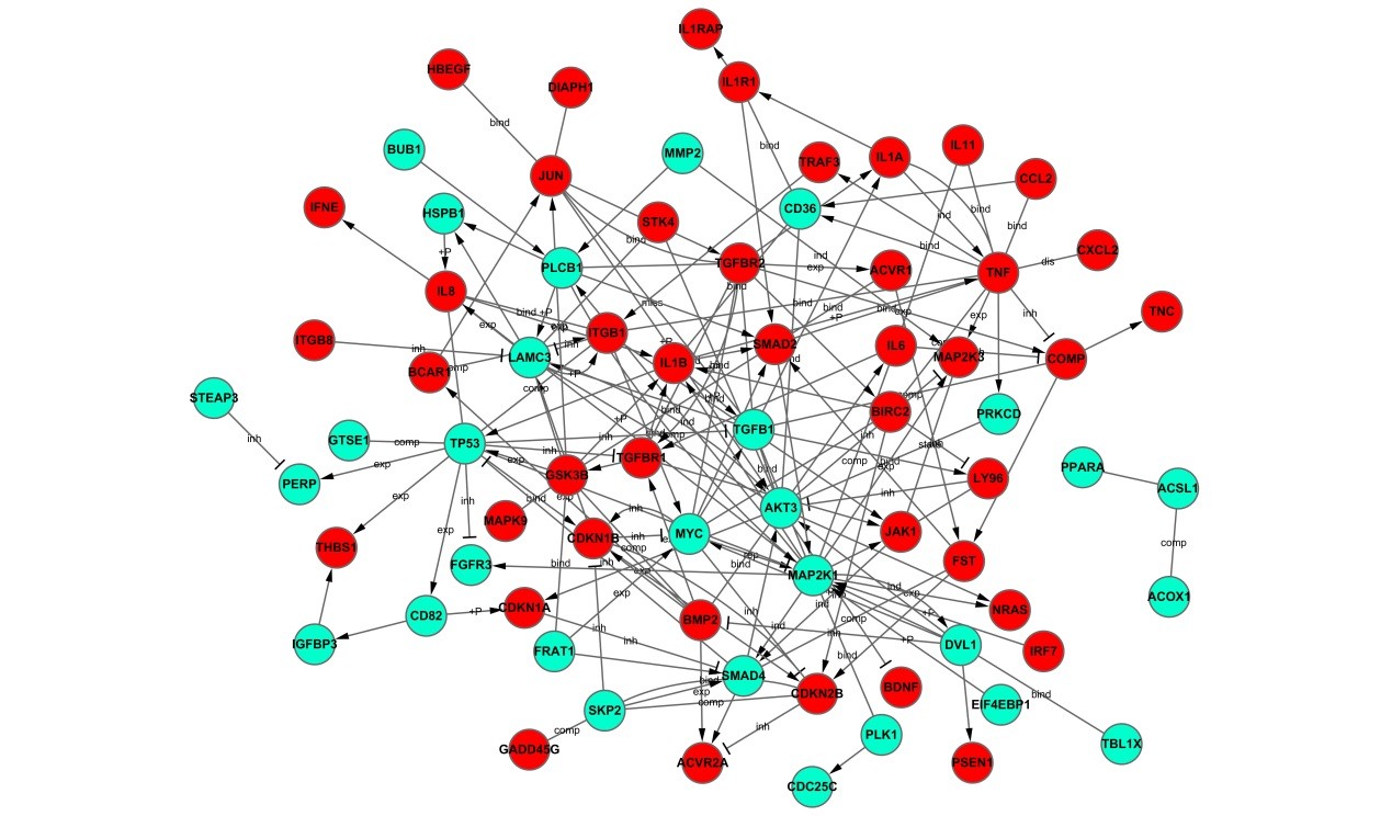 l 文本文件:每个mRNA的Degree,每个mRNA对应的KEGG,每个mRNA相互作用的具体关系(激活,抑制等) Demo结果: Demo结果解读: 结果中显示了差异的mRNA之间的信号调控情况,红色为上调的差异基因,蓝色为下调的差异基因。 展示的所有图表均为demo数据结果,在具体分析过程中可能出现微调,所有结果以最终报告为准。